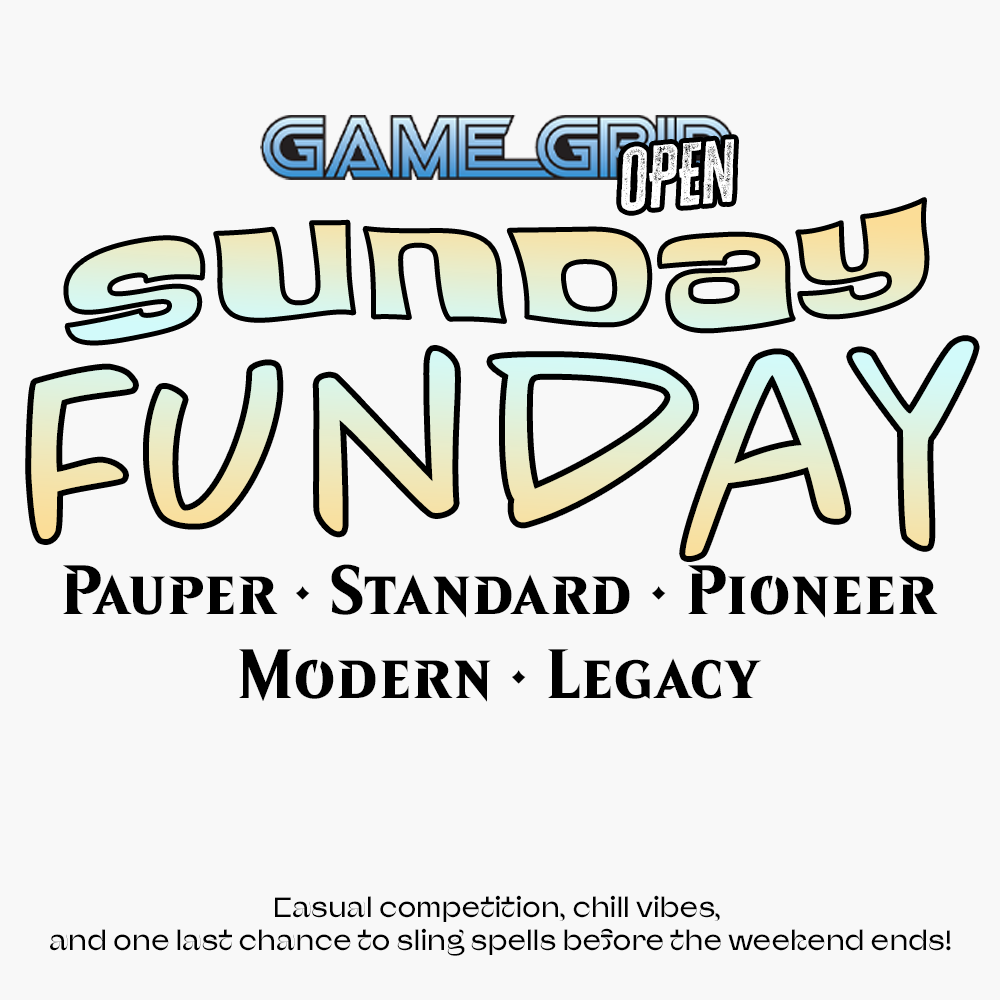 Close out your weekend with Sunday Funday, a laid-back tournament series featuring your favorite constructed formats, good vibes, and plenty of prize tix. Bring your favorite deck, play some fun matches, and enjoy one last round of Magic before the weekend ends. It’s casual, it’s competitive (just a little), and it’s always a good time!